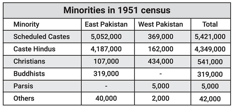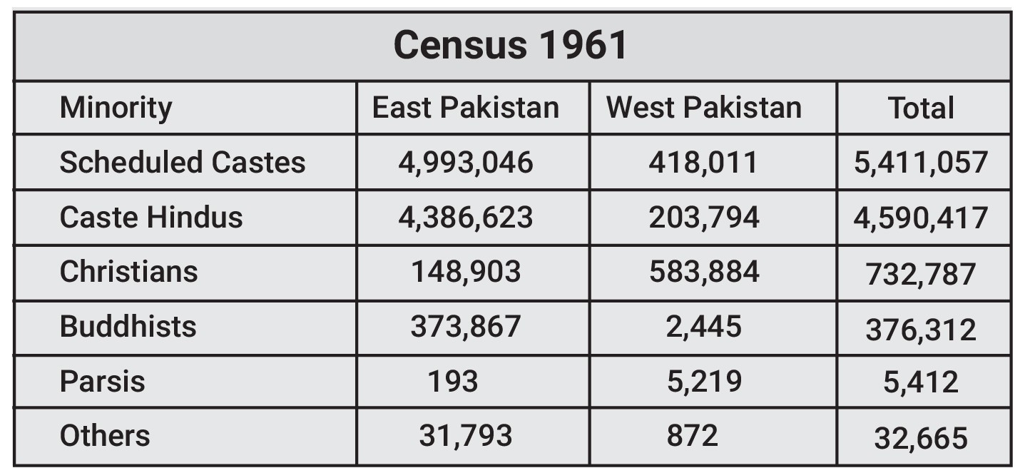 According to the 1951 census, there were 369,000 Scheduled Castes and 162,000 upper caste Hindus in West Pakistan while in East Pakistan the Scheduled Castes were 5,052,000 (about 12 percent of the East Bengal population) and Hindus were 4,187,000 (about 10 percent of East Bengal population). So Hindus and Scheduled Castes made up about 22 percent of the total population of East Pakistan.