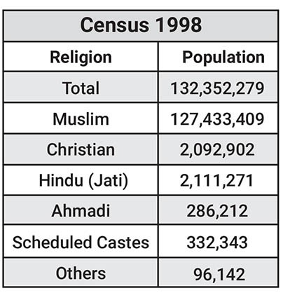 The 1998 census says that there is 1.6 percent Jati (upper caste), Hindus who make up about 3,360,000 living in this country while there is about 0.25 percent of 525,000 scheduled caste Hindus live in Pakistan.