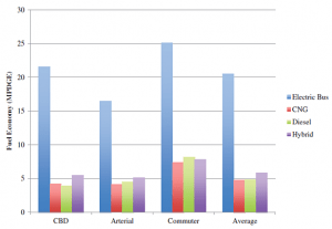 Fuel economy of buses measured at the Federal Transit Authority (FTA) Altoona Bus Research Test Center. CNG = Compressed Natural Gas. CBD = Central Business District