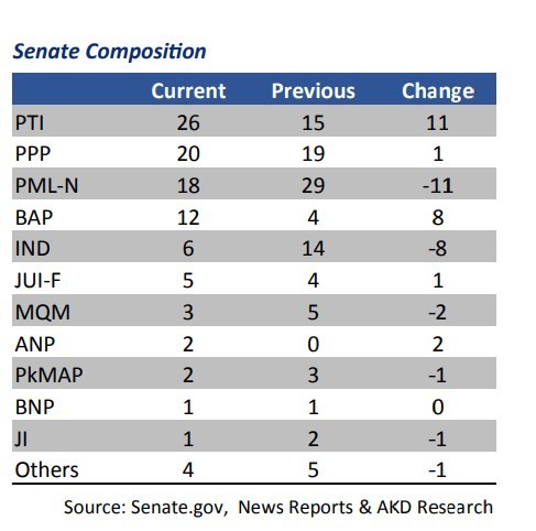 Looking at the broader picture, nothing much has changed in terms of Pakistan’s political set-up – PTI continues to be the largest party in the Lower House and has just become the largest single party in the Upper House. On the flip side, a key near term headwind to potentially watch will be the election of the Senate Chairman.