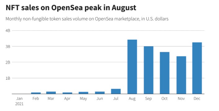 Sales peaked in August, then declined in September, October and November before picking up again in December, data from the biggest NFT marketplace, OpenSea, showed.
