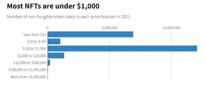 While the most expensive known NFT sale was $69.3 million, a common price range was $100 to $1,000, NonFungible.com said.