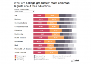 Not all graduates wish they’d chosen another path, however. Those with engineering degrees had the fewest regrets of anyone surveyed, with 42 percent satisfied with their college education, a figure that will come as no surprise to advocates for the expansion of STEM programs in schools. But education majors ranked second in terms of satisfaction: 37 percent reported no regrets, outstripping computer science graduates by more than two percentage points. STEM grads were also less likely to regret taking out student loans – not too surprising given the relatively high salaries available in those fields.