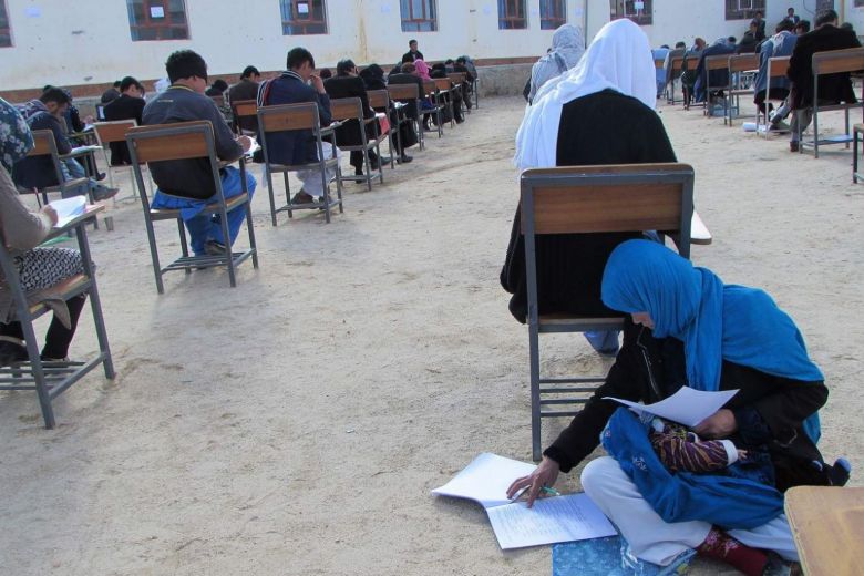 Afghan farmer Jahantab Ahmadi sits on the ground, her baby resting in her lap, as she focuses on the university entrance exam she hopes will help her fulfill her dreams. The powerful photo, taken by a professor at Nasir Khusraw private university in central Afghanistan, has gone viral after striking a chord in a country where most women are illiterate and treated as second-class citizens.