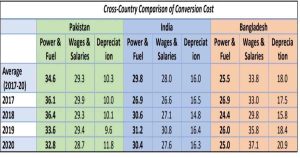 The cross-country comparison in the cost of conversion in the table below shows that the textile units in Pakistan are incurring power and energy costs 2.4 percentage points more than India and 7.8 percentage points higher than Bangladesh. This demonstrates that the ideal, regionally competitive electricity tariff would be around 7.4 cents/kWh.