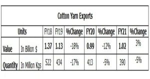 - Exports of cotton yarn in FY21 have decreased by 5% in quantitative terms while value has increased by 3% as compared to FY20.