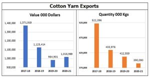 According to PBS data, over the last four years, cotton yarn exports are on a declining trend both in quantity and value terms. It showed that cotton yarn produced domestically is being used in the value-added sector which is evident from exports figures.