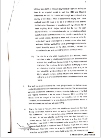 However, the most explosive claim made by the Judge in the affidavit alleges a meeting with Former PM Nawaz Sharif whose case he was hearing. The meeting took place in Jati Umra where bribery offers were made.