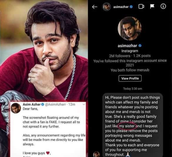 Shortly after the rumors were trending on social media there was a photoshopped screenshot of Asim Azhar allegedly addressing a fan in which he denied any such rumors of his engagement stating “I consider her just like my sister and I request you to please remove the posts portraying wrong messages about me and Merub,” in the screenshot.