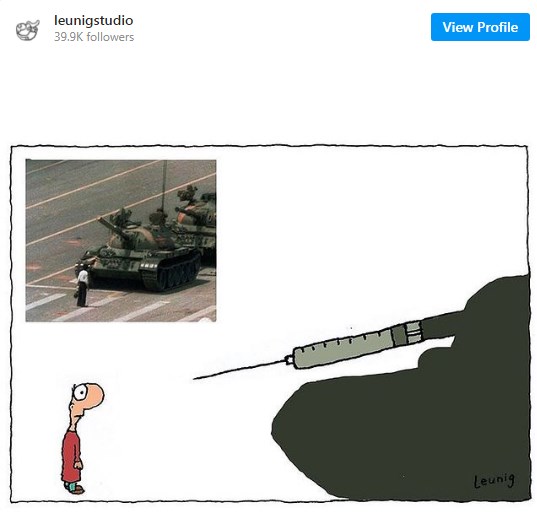 Speaking to The Australian on Monday, Leunig said that while the editorial team has censored about a dozen of his works this year, the last straw appeared to be an anti-mandate cartoon which was a play on the iconic ‘tank man’ photo. Leunig’s cartoon shows a man staring down a tank, with its main gun being replaced by a syringe.