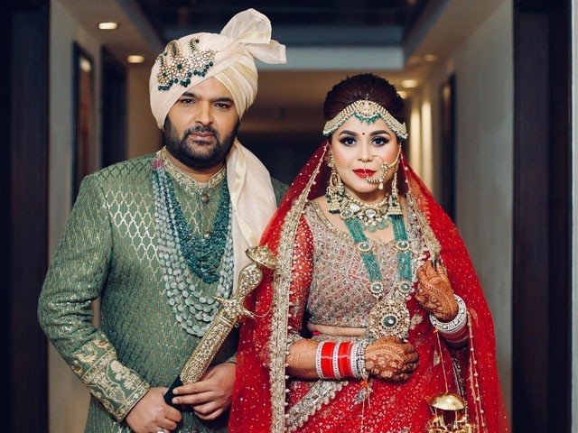 Kapil Sharma wore a green sherwani, a pink turban with a triple Kalji on his turban while the bride stuck to traditional red wedding attire. Sharma held a sword in his hand while posing for the picture with the bride.