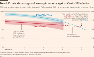 A separate British public health study found last week that protection from either the Pfizer-BioNTech or the AstraZeneca vaccine against the now prevalent Delta variant of the coronavirus weakens within three months.