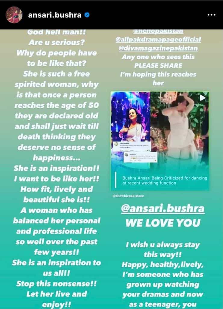 The versatile actress Ushna Shah also came to Bushra Ansari’s rescue saying that if our actress danced happily at a wedding a few months after her sister’s death, she should not face criticism for how she became happy so quickly because we are not aware of what a person is going through internally.