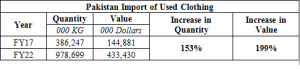 In the last five years, Pakistan’s imports of worn clothing increased by 153 percent in quantitative terms and nearly 200 percent in value terms.