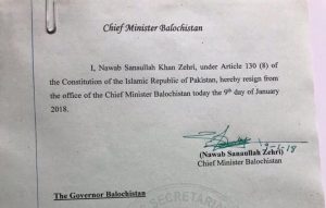 Sanaullah Zehri finally succumbed to opposition pressure today and resigned from his position as the Chief Minister of Baluchistan. He presented his resignation, under Article 130 (8) of the Constitution, to the governor of Baluchistan Muhammad Khan Achakzai in a meeting regarding the no-confidence motion submitted against him in the provincial assembly.