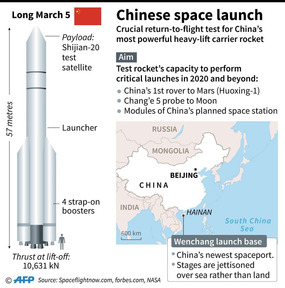 The heavy lift Long March 5 rocket carrying a Shijian 20 test satellite payload blasted off from the Wenchang launch site on the southern island of Hainan at 8:45 pm (1245 GMT), a livestream from state broadcaster CCTV showed.