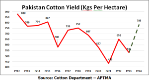 The data shows fluctuations in cotton yield (kg/ha) over several fiscal years, indicating varying agricultural conditions and practices in the cotton industry. These changes impact farmers’ incomes and the overall economic stability of the region.