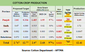 The cotton crop production assessment for 2023-24 also presents an opportunity for Pakistan’s cotton sector, with positive indicators, particularly in Punjab and Sindh. Punjab is close to achieving its proposed target with a 97% progress rate, which could result in substantial production of 8.09 million bales. Sindh, though at 93% of its target, still expects production of 3.73 million bales. KPK and Baluchistan have also shown impressive growth, surpassing their targets by 150% and 138%, respectively.
