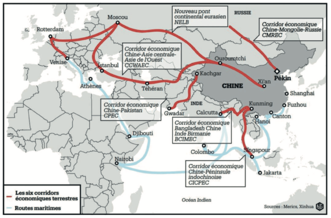 1.New Eurasian Land Bridge (NELB) 2.China-Mongolia-Russia Economic Corridor (CMREC) 3.China-Central & West Asia Economic Corridor (CCWAEC) 4.China-Indo-China Peninsula Economic Corridor (CICPEC) – Greater Mekong Sub-region 5.China Pakistan Economic Corridor (CPEC) 6.Bangladesh-China-India-Myanmar Economic Corridor (BCIMEC)