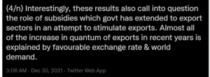 The tweet author questions “subsidies” to exporters and falsely attributes the growth to exchange rate