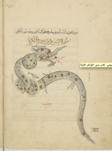There is dragon-like imagery in four constellations in Al-Sufi’s manuscript. The images below are from the manuscript Kitab Suwar al-Khawakib al-Thabitta currently held in the Paris Bibliotheque Nationale, MS Arabe 5036, Fol. 34. It has been dated to 1436 AD. Its images are far more delicately rendered, and are far more intricate than those in older, surviving copies of the treatise, in particular MS Marsh 144, held at the Bodleian Library at Oxford University. The Bodleian manuscript is believed to be the oldest surviving illustrated manuscript in Arabic. It is widely believed that this manuscript is the copy made by Al-Sufi’s son, and was completed between 1009 – 1010 AD.