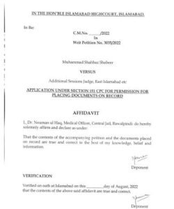 “I, Dr. Nouman ul Haq, Medical Officer, Central Jail, Rawalpindi: do hereby solemnly affirm and declare as under that the contents of the accompanying petition and the documents placed on record are true and correct to the best of my knowledge, belief, and information,” the affidavit read.