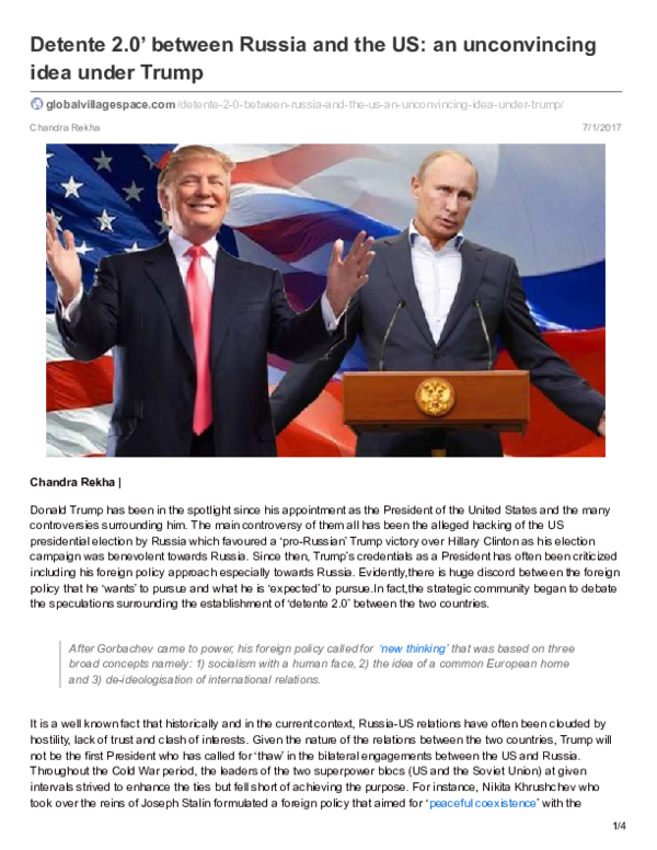 Donald Trump has been in the spotlight since his appointment as the President of the United States and the many controversies surrounding him. The main controversy of them all has been the alleged hacking of the US presidential election by Russia which favoured a ‘pro-Russian’ Trump victory over Hillary Clinton as his election campaign was benevolent towards Russia. Since then, Trump’s credentials as a President has often been criticized including his foreign policy approach especially towards Russia. Evidently,there is huge discord between the foreign policy that he ‘wants’ to pursue and what he is ‘expected’ to pursue.In fact,the strategic community began to debate the speculations surrounding the establishment of ‘detente 2.0’ between the two countries.