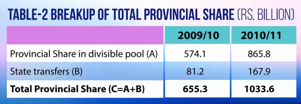 It may be pertinent to indicate here that the divisible pool consists of federal taxes in income tax, sales tax, customs duties, CVT, and FED net of gas. Table 2 highlights the breakup of total provincial share.