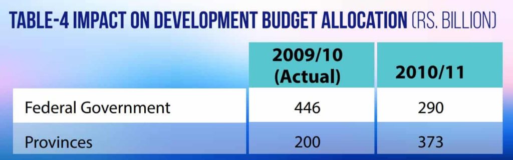 Given, a number of subjects have been moved to the provinces through the abolition of the concurrent list, the increase in their share make sense. Table 4 highlights the impact of 7th NFC Award on the development budgets of federal and provincial governments, respectively.