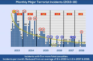 DG ISPR: I think I won’t go into the percentage of it, but the number of incidents has decreased massively, and the number of casualties has decreased. Yes, of late we have seen some surge in activities along the border regions, but it has other connections as I revealed in the dossier that we gave.