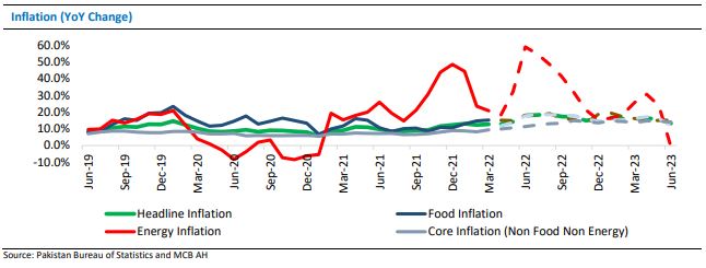 CPI-based inflation for April 2022 jumped to 27 month high of 13.37 percent, taking a 10MFY22 figure of 11 percent compared to 8.6 percent in the same period last year. The commodity supercycle is the major contributor to rising price levels in the economy. With already a high inflation base, raising the energy tariff may push the inflation up to an average of around 12 percent for FY22, and a sustained price level may inch up the inflation to the north of 15 percent in FY23.