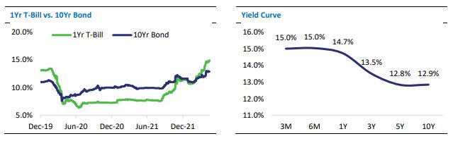 Yields in the fixed income market have already started incorporating the widening fiscal deficit and higher inflation expectations going forward. One-year T-Bill is already trading around 2.45 percent above the SBP policy at 14.7 percent, the highest since 1998. SBP is expected to raise interest rates by 1-1.5 percent in upcoming monetary policy in response to rising inflation expectations and discourage aggregate demand.