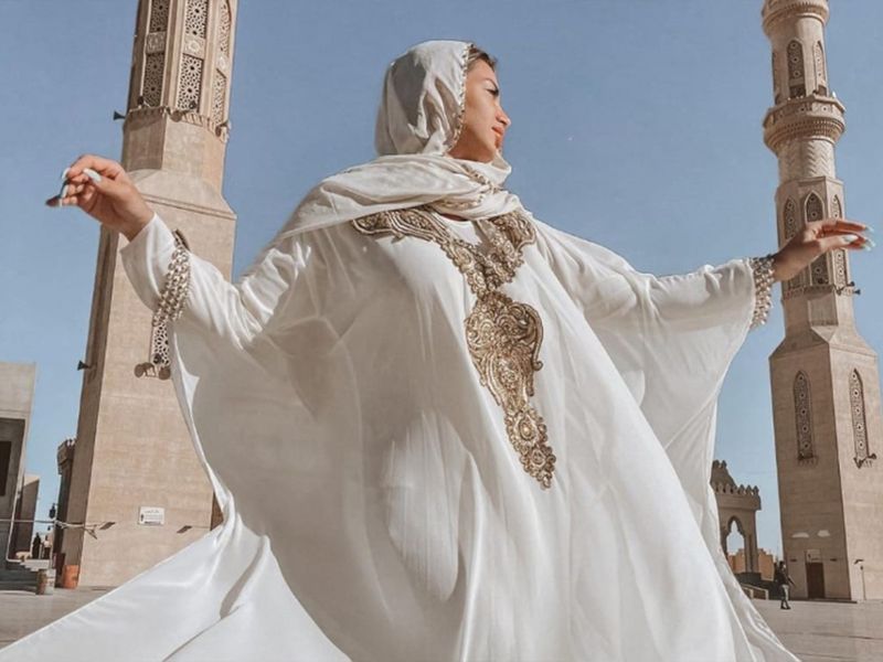 Dancer Ekaterina Andreeva, a famous Russian dancer, known as Johara or ‘jewel’ in Arabic, posted her images on Instagram. The dancer was seen wearing a long white abaya and a hijab headdress while standing in the courtyard of the famed Al Meena (Port) Mosque in the resort town of Hurghada.