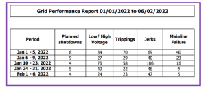Furthermore, as modern textile machinery involves sensitive equipment, it requires a consistent standard power supply without interruptions or variations. Unwarranted interruptions, inordinate breakdowns, fluctuating voltage and flicker are resulting in huge financial and performance losses, and consequently lower exports. Sample details of the shutdown, unstable voltage, tripping, jerks and mainline failure from 1st January to 6th February on actual grids is given in table below.