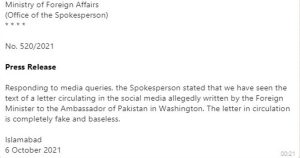 A statement from the office of the spokesman of the Foreign Office while responding to media queries, said: “we have seen the text of a letter circulating in the social media allegedly written by the Foreign Minister to the Ambassador of Pakistan in Washington.”