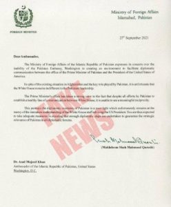 The letter was simultaneously picked up by several Indian media houses, that in the past few months have been churning out a huge amount of fake news against Pakistan, particularly about Pakistan’s alleged role in Panjshir.