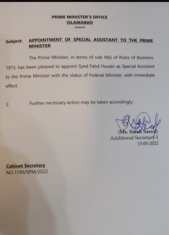 “The Prime Minister, in terms of rule 4(6) of Rules of Business, 1973, has been pleased to appoint Syed Fahd Hussain as Special Assistant to the Prime Minister with the status of Federal Minister, with immediate effect,” read a notification issued by cabinet division.