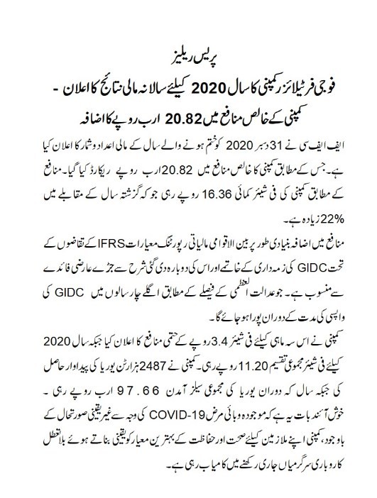 Fauji Fertilizer Company (FFC) has announced its financial results for the year ended December 31, 2020 with net profitably of Rs 20.82 billion. The profitability translated into Earning Per Share (EPS) of Rs 16.36 which was 22% higher than last year.