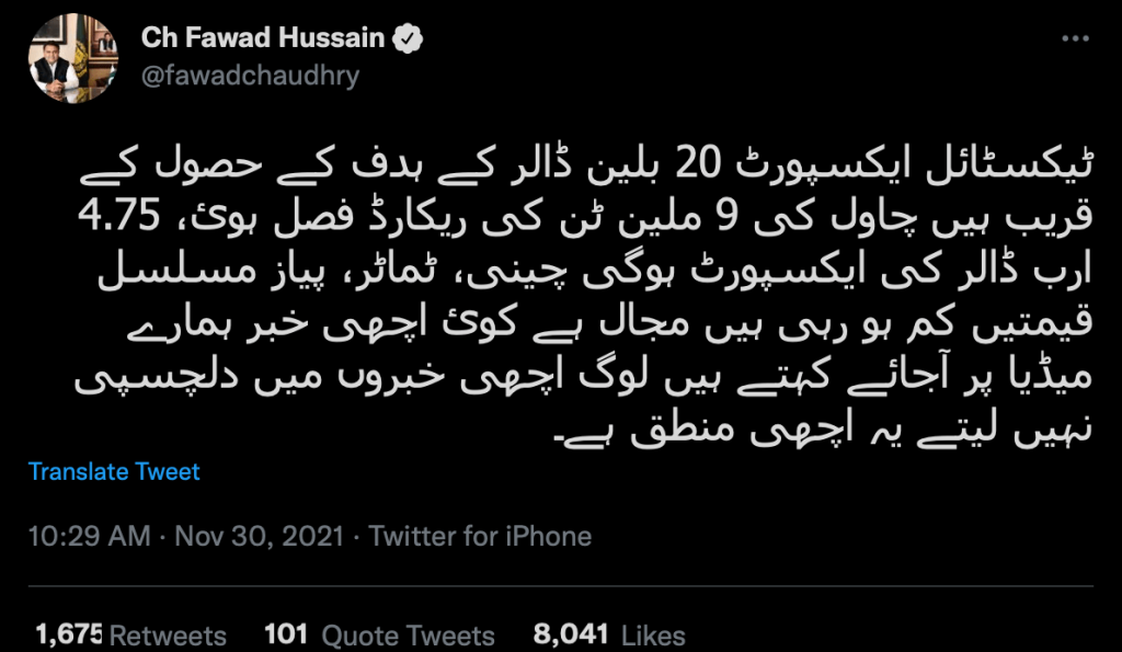 The federal minister, who is famous for being outspoken, noted that the media was only focussing on the negatives in hopes of bandwagoning on the blame train. In his tweet, Fawad Chaudhary mentioned an increase in exports of various products such as textile, sugar, rice and how the media has turned a blind eye to all of this.