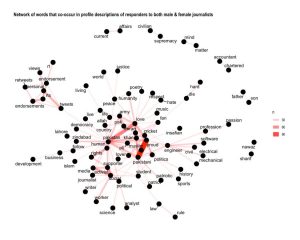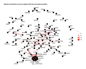 When I plotted the co-occurrence of words in a network, the picture became clearer because then, I could see how certain words were always associated with women journalists, and the strength of co-occurrence signified by the color makes apparent the context of words.