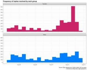 To find the answers to my questions, I decided to base my work on empirical evidence and facts so that no bias clout my assessment. I began by randomly choosing 16 prominent male journalists on Twitter and the same number of female journalists that were among the signatories of the statement. Next, I used Twitter’s REST API through R programming language’s package “rtweet” and collected all the replies received by both male and female journalists in my sample.