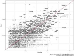 The analysis indicates that usually male journalists receive a lot more responses compared to females but on 12th August, the day they published their statement, the number of replies significantly increased (see Figure1). But I was interested in what was said in those responses. So, to do that, I took advantage of Natural Language Processing (NLP) and calculated the co-relation of words used in the replies for each group. Though most words in Figure 2 reflect nothing vile, especially for male journalists, however, the words such as “lifafa”, “lies”, and “oratcard” were more likely to be used in replies sent out to female journalists.
