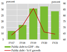 The pace of expansion in public debt was the lowest since FY17. The composition of public debt further tilted towards long-term debt, while the country was also able to diversify the financing resources during FY21.