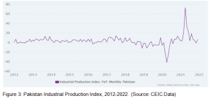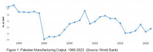 Manufacturing output as a percentage of GDP has been falling since its peak of 15.71% in 1994, as shown in the graph below (World Bank, 2023). In the last twenty years, Pakistan has experienced meager manufacturing growth of 10.22% in 2000 to 11.91% in 2022. Pakistan’s industrial production index growth rate has been stagnant at approximately 4.2% since 1998, with only a sharp decrease and corresponding increase during and after the COVID-19 pandemic (CEIC Data, 2022). Moreover, GDP from manufacturing is approximately half of the GDP from agriculture, and approximately one-fifth of the GDP from services (State Bank of Pakistan, 2022).