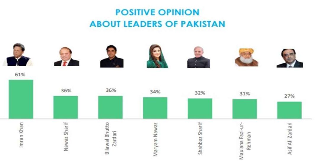 A survey conducted by Gallup Pakistan has revealed PTI Chairman and former Prime Minister Imran Khan as the most popular leader in the country as 61% of Pakistanis gave him a positive rating.
