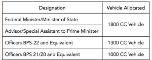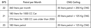 Officials with vehicles above the aforementioned ceiling are provided vehicles on an ad-hoc basis and will continue to use the vehicle until it is due for replacement. Furthermore, government officials BPS-20 and above are also allocated petrol and CNG ceilings as follows: