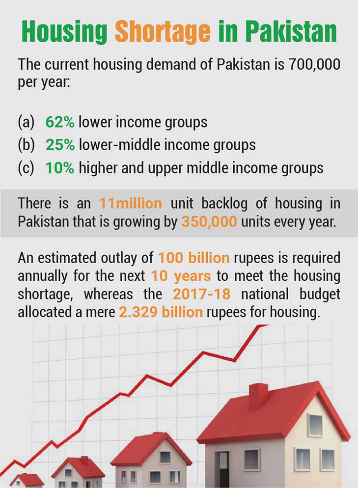 The housing gap in Pakistan is huge and growing dramatically. In 1998, the housing stock was 19.2 million, while the shortage was 4.3 million. According to the population census of 2017, the housing stock is now 32.2 million, of which 39 percent is urban. Over the next 20 years, the annual urban population increase is expected to be about 2.3 million per year (around 360,000 households at 6.35 individuals per household).