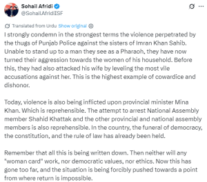 KP Chief Minister Sohail Afridi criticised the police action, noting that attempts were also made to arrest MNA Shahid Khattak and other lawmakers. “This is today’s Pakistan—where the sanctity of a woman’s veil is violated. Their only fault was coming to meet their brother,” former president Arif Alvi said.