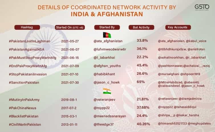 The details of coordinated network activity shows that most of these campaigns were built on common narratives being propagated by both India and Afghanistan and comprised of known state linked accounts.