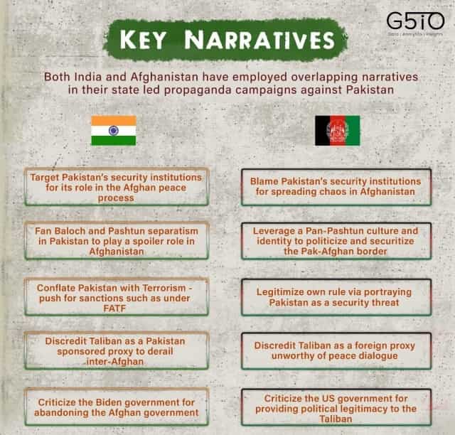 Key Narratives by Afghanistan, India on anti Pakistan campaign were to target and blame Pakistan’s security institutions, fan Baloch, Pashtun separatism, describe Taliban as sponsored by Pakistan, criticise the US government for abandoing Afghan government.